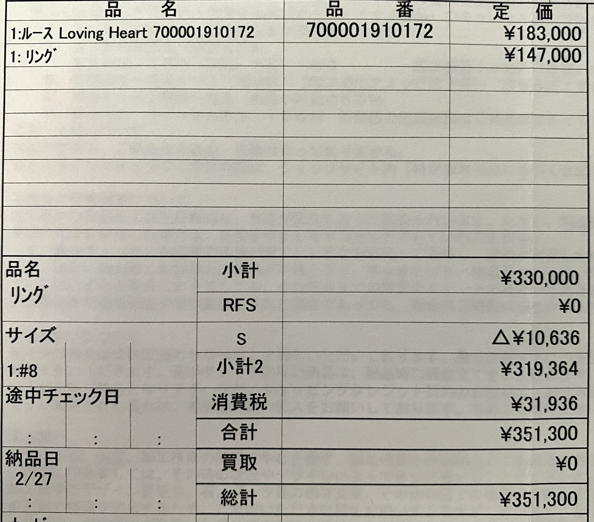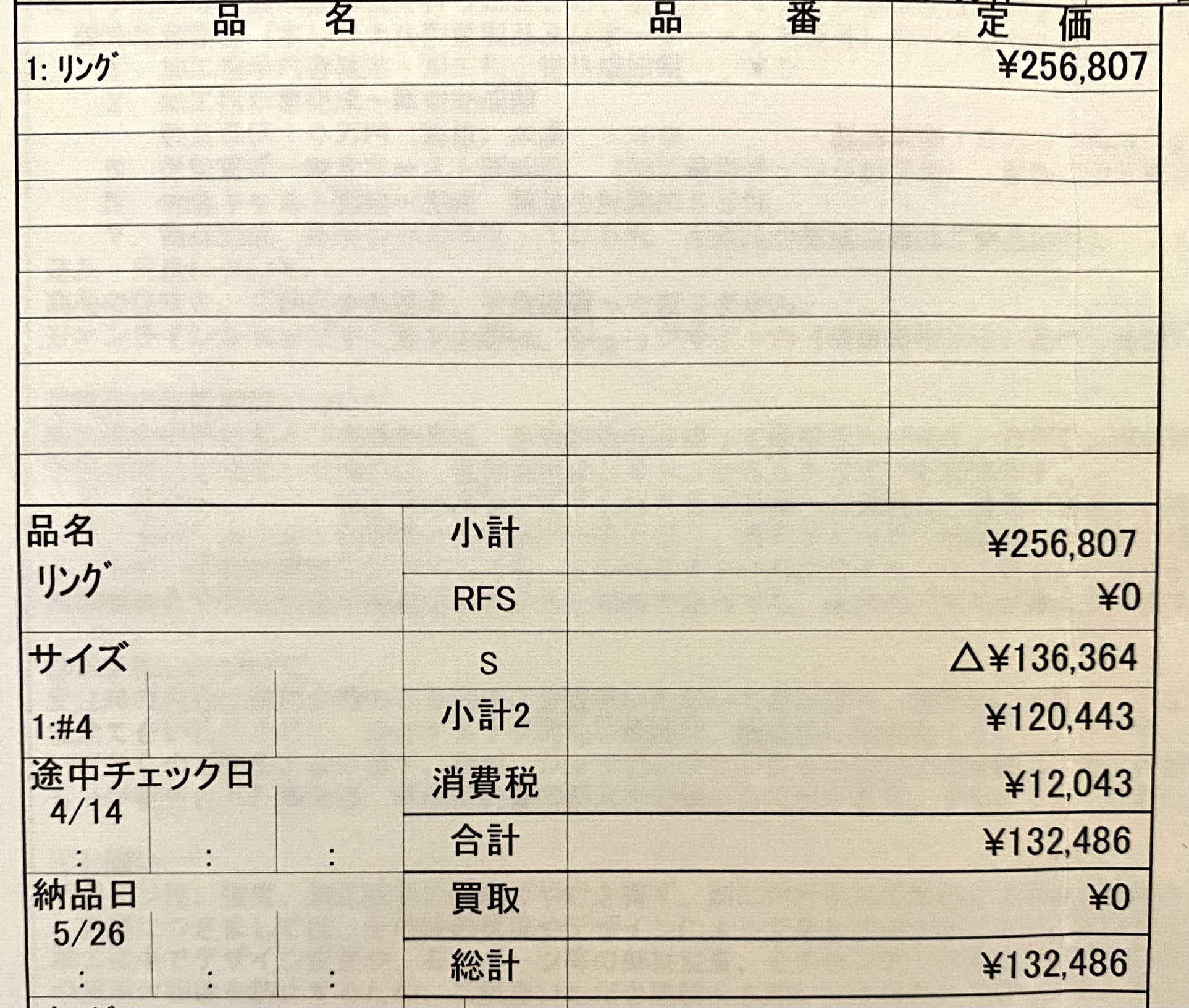 プロポーズリングのときに150,000円(税込)を支払っているので、デザインしてもらった婚約指輪の256,807円(税抜)からプロポーズリングの支払い分を差し引いて、132,486円になっています。