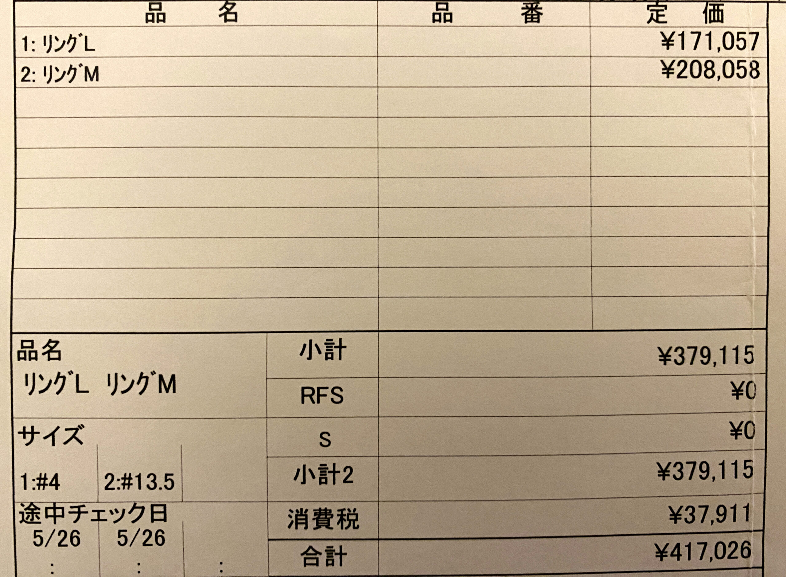 先ほど紹介したベースになったデザインのShareとKakurenboの金額を見てからだと、オーダーメイドした指輪は正直に言ってしまうと高く感じてしまうと思います。